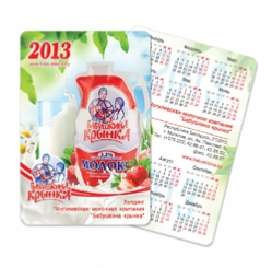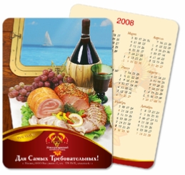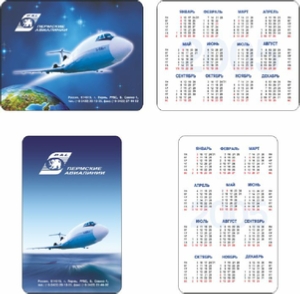 Размер карманного календаря 70х100 мм. На лицевой стороне такого календаря расположенна картинка с логотипом Вашей фирмы и рекламой, в то время как вторая сторона является непосредственно текущим календарём.